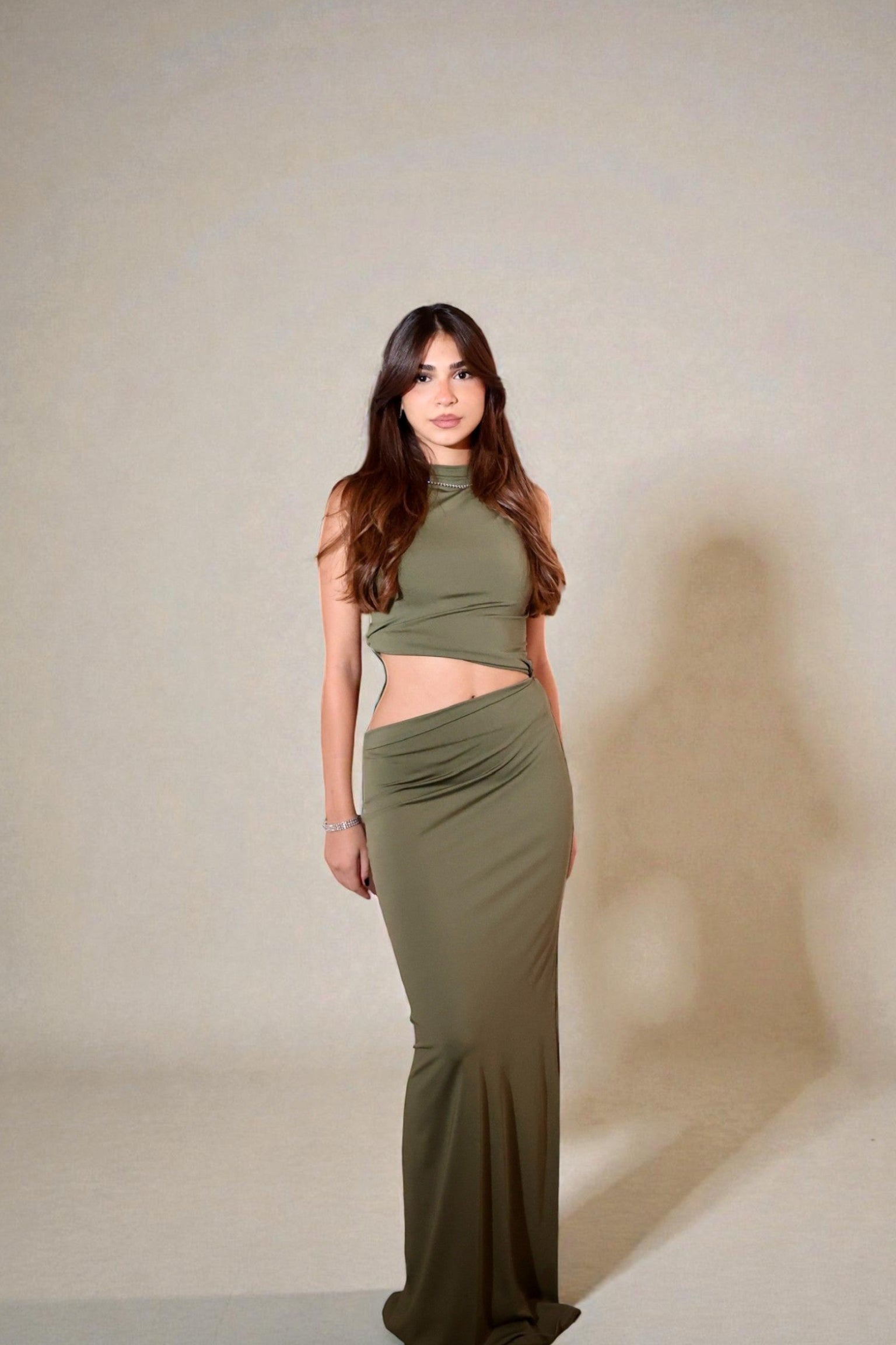 Two-piece with subtle waist cut-out and tailored fit. Available in Black and Olive Green.