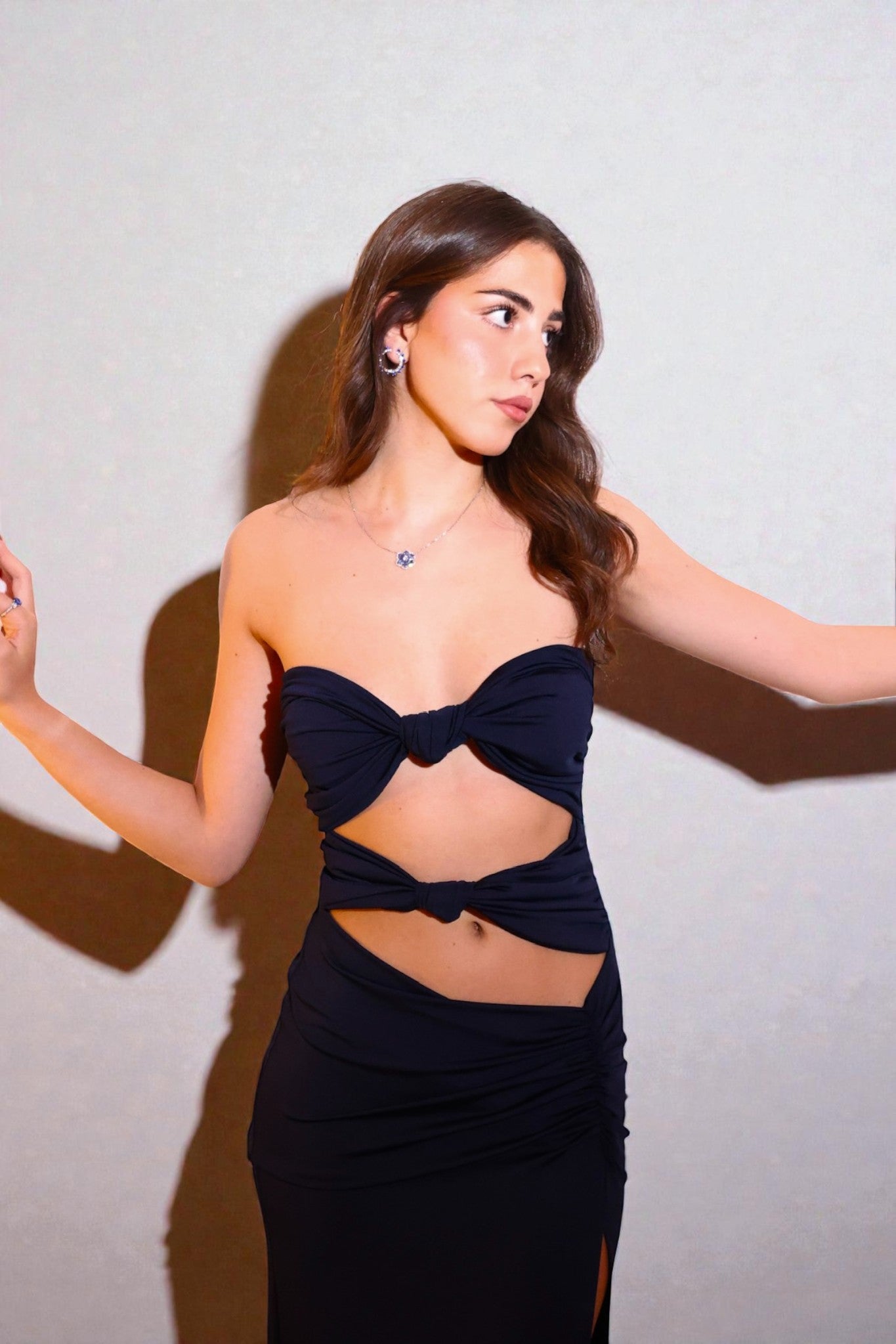 Strapless navy gown with sculpted cut-outs and soft draping.