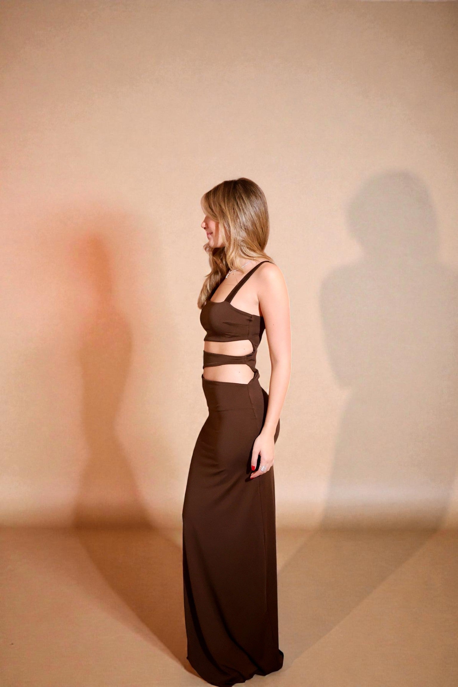 Cut-out gown in rich brown with a sleek, body-skimming shape.